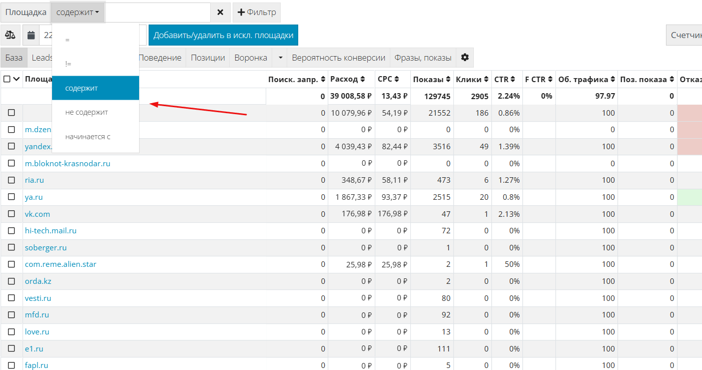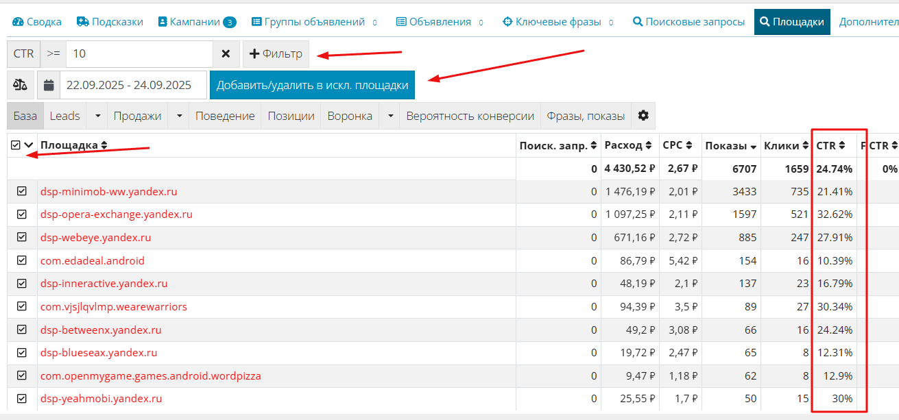 В первую очередь удаляем площадки, у которых CTR > 10%. Чтобы добавить площадку, ее нужно выделить галочкой и нажать кнопку “Добавить, удалить ….”.
